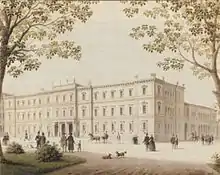 On 18 January 1846, he became engaged in Palermo to the 23-year-old Grand Duchess Olga Nikolaievna of Russia, the daughter of Emperor Nicholas I of Russia and Charlotte of Prussia (a daughter of King Frederick William III of Prussia and sister to William I, German Emperor).[2] Olga's grandmother, Empress Maria Feodorovna, was the younger sister of Charles' grandfather, King Frederick. They married on 13 July 1846 at Peterhof Palace in Petergof, Saint Petersburg. The young couple moved to Stuttgart, and from 1854 until Charles' accession in 1864, lived at the Crown Prince Palace (German: Kronprinzenpalais) built between 1846 and 1850 at state expense on Königstraße, corner of Schloßplatz (which was demolished in c. 1962). For their summer residence, the crown prince couple stayed at Villa Berg, which had been designed by Christian Friedrich von Leins according to their own ideas and is considered one of the first Renaissance Revival style buildings in Germany.