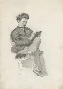 The painter Walter Sickert cites Keene often in his book A Free House! or the Artist as Craftsman edited by Osbert Sitwell.[3] Sickert describes the drawings of Keene as having an authenticity about them because he draws from life as a direct observer and avoids the usual cliches that were common in his day. Sickert urges the use of "sight size" drawing from life, by which he means to draw a 6-foot man from 8 feet away so the size of the figure can be seen as a whole and brought to the page as if one was drawing on a pane of glass while looking at the subject. "And so, from the incised designs on bones scratched by primeval man, to the drawings of Charles Keene, has line been the language of design... Line supposes an unbroken thought, a sentence said in a breath. Line supposes that the hand is not taken off the paper."[4]