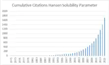 His theories were put to immediate use during his 8 years (1968–76) at the R/D Center, PPG Industries in Pittsburgh where the universality of HSP became apparent as they were shown to work equally well for problems such as optimising the compatibility of pigments within paint and ink formulations.[5] Gradually they became adopted more widely as shown by the cumulative graph of Google Scholar citations for the phrase "Hansen Solubility Parameter".