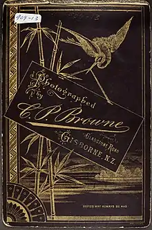 By 1883 Browne was advertising as 'Gisborne Photographic Studio'.[8] In 1891 his studio in Gladstone Road, Gisborne was extended for greater capacity.[9]