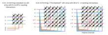 Rectangular array - A square/rectangular diagonal array can be formed by double folding the parallel conductors - see diagram on right. Unsplit I/O conductors enter from the end of the array.