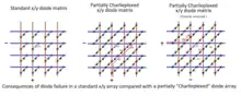40. Rust, Peter (2013-04-10). "LED-Displays - Matrixtreiber-Topologien unter der Lupe" [LED displays - Matrix driver topologies in focus]. elektroniknet.de (in German). WEKA FACHMEDIEN GmbH. Archived from the original on 2022-05-12. Retrieved 2022-05-13. […] Die möglichen Ghosting-Effekte und Probleme mit offenen LEDs haben die Verbreitung der Charlieplexing-Topologie in der Vergangenheit stark gebremst. Eine »Crossplexing« genannte Verbesserung des Verfahrens verspricht nun, die Nachteile des bisherigen Verfahrens zu eliminieren […] Die Kurzschluss- und Defekterkennung des ICs beruht […] auf der Vorwärtsspannung der in der Matrix verwendeten LEDs. Das Bauelement bestimmt eine optimale Spannungsschwelle für Defektsituationen und konfiguriert sie automatisch. Die Kenntnis der Position eines Kurzschlusses oder Defekts eliminiert natürlich noch nicht die Ghosting-Effekte. Wird jedoch eine Unterbrechung festgestellt, kann das System die Koordinaten des Defekts abspeichern. […] Jedes Mal, wenn der Treiber angewiesen wird, diese LED anzusteuern, wird diese Instruktion ignoriert. Diese Maßnahme vermeidet das unbeabsichtigte Aufleuchten von LEDs im Rest des Punktmatrixdisplays. […]
