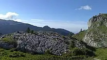 Charmant Som is located within the Chartreuse Regional Nature Park, which was created in 1995 and, since the revision of its charter in 2008, covers 767 km2 (296 sq mi).[57] The summit is also classified as a type I Natural area of ecological, faunal and floristic interest, covering 1,140.8 hectares (2,819 acres) from the mountain's two northern crests to La Pinéa, including the mountain pastures.[13] Finally, the northern slope of the mountain, as far as the Gorges du Guiers Mort to the north and the Col de la Grande Vache to the west,[58] is part of a Natura 2000 zone designed to preserve biodiversity over 2,329 hectares (5,760 acres) under the name "Ubacs du Charmant Som et Gorges du Guiers Mort". It has been recognized as a Site of Community Importance (SCI) since 2013.[14]