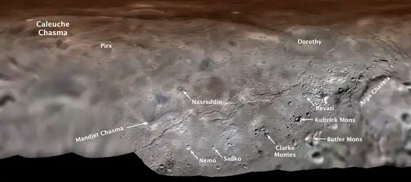 - ↑ International Astronomical Union. Pluto's largest moon, Charon, gets its first official feature names. Consulted 7 February 2023.