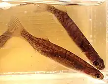 The Chatham mudfish is the most Galaxias-like of all the mudfishes, with a short body and small pelvic fins, and is closely related to the Canterbury mudfish.[5] Neochanna rekohua averages 75 mm (though the largest individuals can reach 175 mm), and is a dark mottled brown. It only lives on the edges of a few peaty lakes amongst submerged wood, so is naturally uncommon, but abundant in the few spots where it occurs.[5]