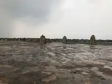 The Chausath Yogini Temple, built in the 9th or 10th century in Ranipur-Jharial, in an isolated position some miles from the towns of Titilagarh and Kantabanjhi in Balangir district, Odisha, is a circular, hypaethral, 64-yogini temple made of sandstone, some 50 feet in diameter.[1] 62 of the yogini images survive. The site, on an outcrop of rock, must have been important, given the presence of a large temple built of brick and several small temples of stone.[1][2][3][4] The primary entrance is an opening in the circular wall towards the east; unlike at the Hirapur yogini temple, there was once a further opening towards the south, now filled in.[1]