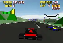 Checkered Flag is a three-dimensional Formula One racing game, similar to the Atari Lynx 1991 video game Checkered Flag and Virtua Racing, where the main goal is to finish a race ahead of other racers controlled by the computer.[1][2][3][4][5] The player can customize the vehicle's overall handling characteristics before a race.[1][2][3][4][6] The player can choose various weather conditions and adjust the number of laps.[2][3][5][6] By entering a cheat code at the options menu, players have access to a night weather condition.[7] During gameplay, the player can alternate between six camera views.[1][2][3][6]