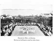 The name of the school was initially the "Protestant Collegiate School." By 1908 it was called the "China Inland Mission school," but later it was usually called the "Chefoo School."[5] Chefoo was a boarding school with students from all over China, many of whom had to travel for weeks to get to the school from where their parents were stationed. In 1940, in one exceptional case, 6-year old David Michell left his parents' home in remote Guiyang on 8 October and travelling by truck, railroad, and ship, accompanied by other students and teacher escorts and delayed by the war between Japan and China, did not arrive in Chefoo until January 1941.[6]