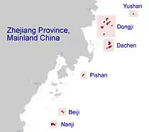 After the Chinese Civil War, the Kuomintang-led Republic of China government lost its control in Mainland China and only held several islands east of mainland Chekiang Province, including Yushan, Toumenshan, Yijiangshan, Dachen, Pishan and Nanji.[3] After losing the mainland, the Nationalists used the islands to stage commando raids into Zhejiang, occasionally penetrating as far as the area around Shanghai.[4] The county governments withdrawn to the islands from the mainland included seven counties, namely Wenling, Linhai, Huangyan, Pinyang, Sanmen, Yueqing and Yuhuan. Chiang Kai-shek, the late President of the Republic of China, appointed Hu Zongnan, the general of the ROC Armed Forces, to establish the "Government of Chekiang Province" on the Dachen Islands in September 1951. Its purpose was to fight against the mainland which was controlled by the Chinese Communist Party.