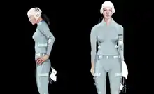 Chell's face and body model were derived from those of the director, producer and voice actress Alésia Glidewell.[4] When making Portal 2, developers considered not bringing back the character.[5][6] However, this was changed as playtesters wanted GLaDOS to recognize them as the person who had killed her in the first game.[1][7] In her original redesign for Portal 2 developers tried to make her look appealing, yet not overdesigned,[6] with nothing made simply for fashion.[5] They explored changing her nationality, and tried to make her look less human due to the "constant dehumanization of these test subjects". Being a test subject, Chell's suit was designed to look neither sexy nor unattractive. The original redesign of the character featured a laboratory hat, which was thought of halfway through the concepting phase.[5][8] Matt Charlesworth, Valve's concept artist, commented that the hat reminded him of test pilots.[5]
