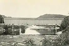 The new bridge connected the new village of South Royalton to the rest of Royalton, and later to the stagecoach route to Chelsea and Tunbridge (present-day Route 110).[2] It was a toll bridge, with gates, a gate keeper, and a few cents' toll. This bridge was torn down in 1903, replaced with a single-lane camelback iron truss bridge, with a cost of $12,282, including about $5,000 for the abutments.[3] Though the iron bridge was the only bridge on the White River to withstand the Great Flood of 1927, the village's approach to the bridge washed away, leaving a 150-foot chasm. A two-lane bridge extension was built of concrete to fill the gap. The 1903 bridge was removed in 1935, after which a new iron bridge was built.[2] The new bridge was a two-lane Parker through truss bridge, and cost $30,021. The bridge was comparable to others built after the 1927 flood, and was identical to Bethel's River Street Bridge, built in 1928.[1]