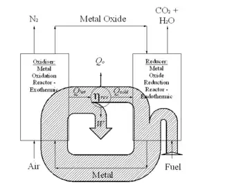 Chemical looping combustion (CLC) uses two or more reactions to perform the oxidation of hydrocarbon-based fuels. In its simplest form, an oxygen-carrying species (normally a metal) is first oxidized in the air forming an oxide. This oxide is then reduced using a hydrocarbon as a reducer in a second reaction. As an example, an iron based system burning pure carbon would involve the two redox reactions: