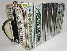 A Chemnitzer concertina is a musical instrument of the hand-held bellows-driven free-reed category, sometimes called squeezeboxes. The Chemnitzer concertina is most closely related to the bandoneón (German spelling: Bandonion), more distantly to the other concertinas, and accordions.