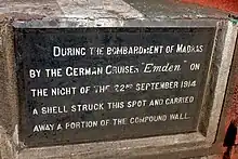 By the late 18th century, most of the southern region of India had been conquered by the British and Madras was established as the capital of the Madras Presidency.[21] During this period, the port flourished under the British rule, becoming an important naval base and urban center. A port at Madras was first suggested by Warren Hastings in 1770 when he was posted here, who later became the first Governor General of India.[8][22] However, it was not until the 1850s that work began on a pier to berth vessels following suggestions from the Madras Chamber of Commerce and Industry. Till 1815, it was an open roadstead and exposed sandy coast, swept by occasional storms and monsoons. At the time, the natural harbour was so shallow that ships had to anchor over 1 km (0.62 mi) offshore, and cargo was delivered to and from the shore in masula boats[23][24] and catamarans.[25] Cargo losses were high, close to 90 percent, in addition to pilfering with several goods from the ships often taken to the nearby evening bazaar.[8] A 335 m (1,099 ft) iron-screw pile pier capable of berthing larger vessels was built perpendicular to the shore in 1861.[26] However, the storms of 1868 and 1872 made the initial piers inoperative. In 1875, Edward VII laid the foundation stone for a new port,[8] and the masonry work for L-shaped breakwaters was started in 1876. The northern and southern groynes of the harbour were constructed, to create a still water enclosure that would be unaffected by storm and surf water. However, the groynes collapsed in 1877. The same year, construction of the south pier was commenced with concrete blocks weighing 33 tonnes each brought from Pallavaram,[8] and the port started handling ships inside the harbour from 1881. However, again the storm of 12 November 1881 completely washed the almost-completed harbour, breaching over half a mile of breakwater.[26] An artificial harbour was then built and the operations were started in 1881, and the pier was rebuilt in 1885, although there was a demand for relocating the entrance. Work on the harbour was completed in 1911.[22] The Chennai Port Trust has taken the year 1881, the year of rebuilding, as the starting year. The cargo operations were carried out on the northern pier, located on the northeastern side of Fort St. George in Chennai. In the first couple of years the port registered traffic of 300,000 tonnes of cargo handling 600 ships. The first railway line in South India was laid between Madras and Arcot which started operating in 1856. By the late 19th century, the port was well connected to the other two important cities in the British colony, viz. Bombay (Mumbai) and Calcutta (Kolkata).[27] In 1904, a new northeastern entrance was added to control siltation in the basin, after closing the original eastern entrance. The port's quays (berths) were constructed at different periods—the South Quay I in 1913, the five west quay berths between 1916 and 1920, the north quay in 1931 and the South Quay II in 1936, in the Inner Harbour, later christened Dr. Ambedkar Dock.[26] Chennai was the only Indian city to be attacked by the Central Powers during World War I[28] when a German cruiser, SMS Emden, shelled the oil depot within the port belonging to the Burmah Oil Company and raided vessels in 1914 disrupting trade, resulting in the death of at least 5 sailors.[8] Other than Calcutta, which was practically taken over by the American army,[29] Chennai port was the only other operational one in eastern waters during the Second World War.[25] In 1911, the Royal Madras Yacht Club (RMYC), which is based within the Chennai Port premises, was founded by Sir Francis Joseph Edward Spring, the first chairman on the Madras Port Trust who was responsible for Chennai becoming a trading hub, especially during World War II.[22][25] In 1916, the harbour office building was constructed.[26]