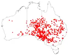 It is found in the IBRA bioregions of Burt Plain, Central Ranges, Channel Country, Coolgardie, Finke, Flinders Lofty Block, Gawler, Great Sandy Desert, Great Victoria Desert, MacDonnell Ranges, Mitchell Grass Downs, Nullarbor, Riverina, Simpson Strzelecki Dunefields, Stony Plains, and Tanami.[1][11] (Bioregions from Victoria, Queensland and New South Wales may not be included.)[12]