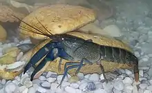 Cherax boesemani is a relatively large crayfish, adult body length is 5–6 in (13–15 cm).[2] Variable blues, reds, and oranges are the predominant carapace colours, which has led to extensive selective breeding to create new commercial strains, with names such as Blue Moon, Supernova, Papuan red, tricolor and Red Brick. Hybrids with C. pulcher commercially known as Thunderbolt Blue Moon are also available.[3]