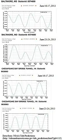 A good example of how the different Chesapeake Bay sites experience different tides can be seen in the tidal predictions published by the National Oceanographic and Atmospheric Administration (NOAA) (see figure at right).