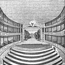The Chestnut Street Theatre (originally named the New Theatre) was the brainchild of Thomas Wignell and Alexander Reinagle who in 1791 convinced a group of Philadelphia investors to build a theater suitable for Wignell's company to perform in. Wignell had not yet formed his company when the New Theatre was being set up to be built, but as the New Theater was being built, Wignell was in England recruiting actors to be a part of his company.[2] The New Theater's design, modeled after the Theatre Royal, Bath, was made possible by John Inigo Richards, Wignell's brother-in-law, who obtained architect Thomas Greenway's original plans.[3]