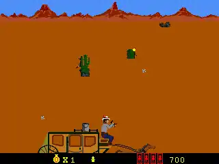 Throughout each stage, Buster is attacked by many enemies and will find himself in a variety of perilous situations. The player must shoot each and any of these dangers before they can harm Buster. Objects that can be shot include knives, arrows, bullets, cannonballs, shovels, and bombs, as well as ghosts, falling boulders, and errant mine carts. Buster will also be attacked by wild animals such as bats, beavers, bears, coyotes, bison, wildcats, wolves, skunks, raccoons, birds, and rats, all of which the player must shoot in order to protect Buster. In addition to these perils, Buster will also encounter gangs of outlaws, which can contain anywhere from two to four members. Outlaws are easily distinguished from other characters due to their flashing colors, and all of them must be “captured” (shot) to complete a stage. Once the player meets this condition, they will be returned to the stage's introduction screen, in which iron bars are placed over “Wanted” posters of each outlaw, all of which have “PAID” stamped on them. From here, the player moves back to the level's stage select screen.