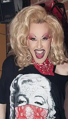 "Chi Chi LaRue" began when Paciotti moved to the Minneapolis-Saint Paul area and started performing in drag as one-half of "The Weather Gals", a "hag drag" revue.[2] He and a friend moved to California, where LaRue was hired by Catalina Video as an administrative assistant and publicist because of his knowledge of porn and the workings of the porn industry.[3] Even as a "DJ" ("DJ Paciotti"), Paciotti conducts most public business as "Chi Chi LaRue", particularly in the pornographic film industry.[2] LaRue has directed hundreds of gay porn films since 1988, mainly for Falcon Studios.[4] He now owns Catalina Video, a label under his umbrella company Channel 1 Releasing.[2]