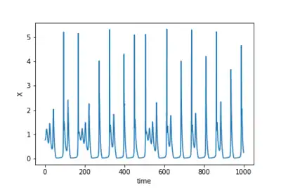 in which, is called activation or action potential variable, and is the recovery variable. The model has four parameters, is a time-dependent additive perturbation or a constant bias, is the time constant of recovery , is the activation-dependence of the recovery process and is an offset constant. The model has a rich dynamics, presenting from oscillatory to chaotic behavior,[4][5] as well as non trivial responses to small stochastic fluctuations.[6][7]