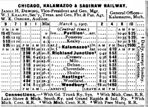 Despite its name, the line linked neither Chicago, Illinois nor Saginaw, Michigan, although it did pivot on Kalamazoo, Michigan. Construction started in 1886 between Kalamazoo, Michigan and Hastings, Michigan; this section was completed by 1888. On September 1, 1889, the northern branch reached Woodbury, on the northwest edge of Eaton county, where it met the Detroit, Lansing and Northern Railroad (later the Pere Marquette Railroad). On December 1, 1901, the southern terminus was extended to Pavilion, Michigan, in southern Kalamazoo County, where it met the Grand Trunk Railway, for a total length of 44 miles (71 km).[7]