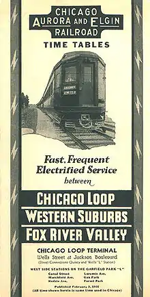 ![]() Map of the Chicago Aurora and Elgin Railroad from a 1936 public timetable folder | |
