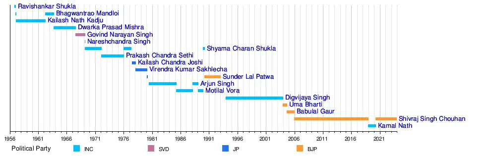 Following Madhya Pradesh's reorganisation on 1 November 1956, 18 people served as its chief minister. Twelve of these belonged to the Indian National Congress, including the inaugural officeholder Ravishankar Shukla. The first non-Congress chief minister was Govind Narayan Singh who defected from the party and lead a Samyukta Vidhayak Dal government from 1967 to 1969. Digvijaya Singh of the Congress became the first officeholder to serve two full five-year terms. He was succeeded by Uma Bharti of the Bharatiya Janata Party, Madhya Pradesh's only woman chief minister. Shivraj Singh Chouhan of the Bharatiya Janata Party is the longest-serving and current incumbent.
