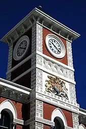 Reputed to be a replica of London's Great Clock of Westminster,[8][28] a working, free standing, four faced turret clock was installed in 1879 within a clock tower.[29] Underneath the east facing clock face is the Royal coat of arms of the United Kingdom.[12] Notable for being unreliable, an electric clock was eventually installed to control the visible faces as slave clocks. While at one time it chimed on the hour and at the quarters,[30] after the mechanisms were damaged in a 1980s fire, the clock became silent.[8]