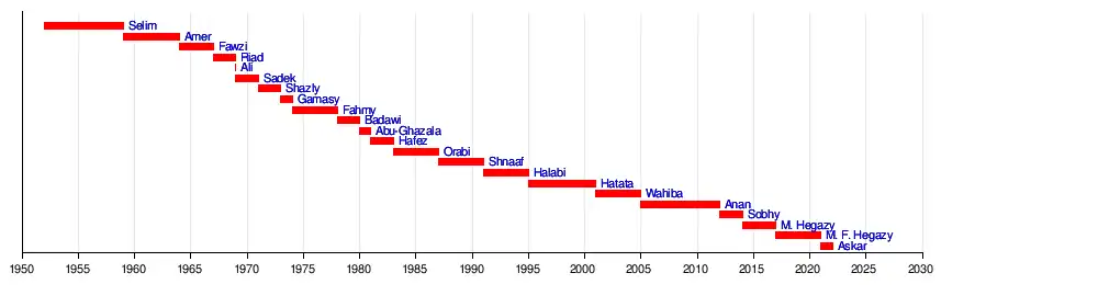 - 1 2 3 4 5 6 7 8 9 10 11 12 13 14 15 16 17 18 19 20 "Former Chiefs of Staff". mod.gov.eg. Egyptian Ministry Of Defense. Retrieved 9 November 2019.
