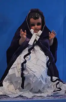 To present the Niño Dios at Mass, tradition states that the image must be dressed in a new outfit. These outfits can vary widely but a number are most popular. For those who observe the three year commitment, the image is dressed in white for the first year, symbolizing purity. This is also the case if the image being presented is new.[3][8] Other common and traditional outfits include Santo Niño de Atocha with crosier and seated on a chair, “Niño de las palomas” (Child of the doves) in a white robe with a dove between the hands, as San Francisco with sandals and brown robe, holding an animal, or “Niño de las azucenas” (Child of the lilies) with a white tunic and holding a bunch of lilies.[7]