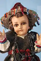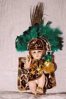 The Niño Dios (literally Child God) of Mexico is a tradition of venerating the Child Jesus in Mexico which has taken root from the time it was introduced in the 16th century and then synchronized with pre-Hispanic elements to form some unique traditions.[1][2] Mexican Catholics have their own images of the Child Jesus, which is honored and celebrated during the Christmas season, especially on Christmas Eve and on Candlemas (2 February). One tradition unique to Mexico is to dress the image in new clothing each year for presentation at Mass on Candlemas. This dress can vary from representations of the saints, Aztec dress, football/soccer players and more. Also, there are Niño Dios images which are locally famous and honored year-round.[3]