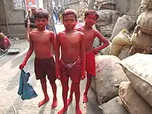 Boys covered with mercury-containing red vermilion chemical during child labour in a factory producing sindoor.
