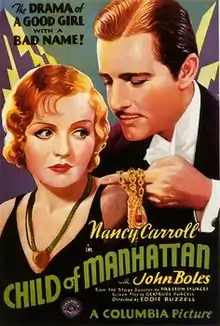 Child of Manhattan is a 1933 American pre-Code melodrama film based on the play Child of Manhattan by Preston Sturges, which was presented on Broadway in 1932. The film was directed by Edward Buzzell and written for the screen by Gertrude Purcell, and stars Nancy Carroll, star of musical comedies at Paramount, John Boles, and cowboy star Charles "Buck" Jones.