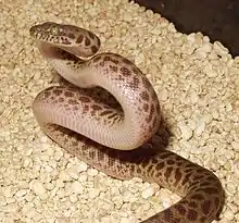Children's python (Antaresia childreni) is a species of nonvenomous snake in the family Pythonidae. The species is named after John George Children. It is a nocturnal species occurring in the northern half of Australia and generally found on the ground, although it often climbs trees. Usually growing to about 1.0 m (3 ft) in length or more depending on the polymorphic variant, it is typically a reddish-brown colour, darker on the upper surface, and with many darker blotches, especially on younger specimens. The Stimson's python variant has much stronger and more variable colours; often being adorned with reddish-brown to chocolate blotches against lighter tan.[4] It feeds mostly on small mammals and birds, and as with other pythons, it constricts its prey before swallowing it whole. It is a popular pet among reptile enthusiasts.