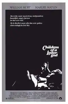 Children of a Lesser God is a 1986 American romantic drama film directed by Randa Haines from a screenplay written by Hesper Anderson and Mark Medoff and based on Medoff's 1979 play of the same name. The film stars William Hurt, Marlee Matlin (in her film debut), Piper Laurie, and Philip Bosco. The film's narrative follows two employees at a school for the deaf: a deaf custodian and a hearing speech teacher, whose conflicting ideologies on speech and deafness create tension and discord in their developing romantic relationship.