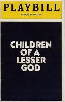 Children of a Lesser God is a play by Mark Medoff, focusing on the conflicted professional and romantic relationship between Sarah Norman, a deaf student, and her former teacher, James Leeds. It premiered at the Mark Taper Forum in 1979, was produced on Broadway in 1980 and in the West End in 1981. It won the 1980 Tony Award for Best Play.