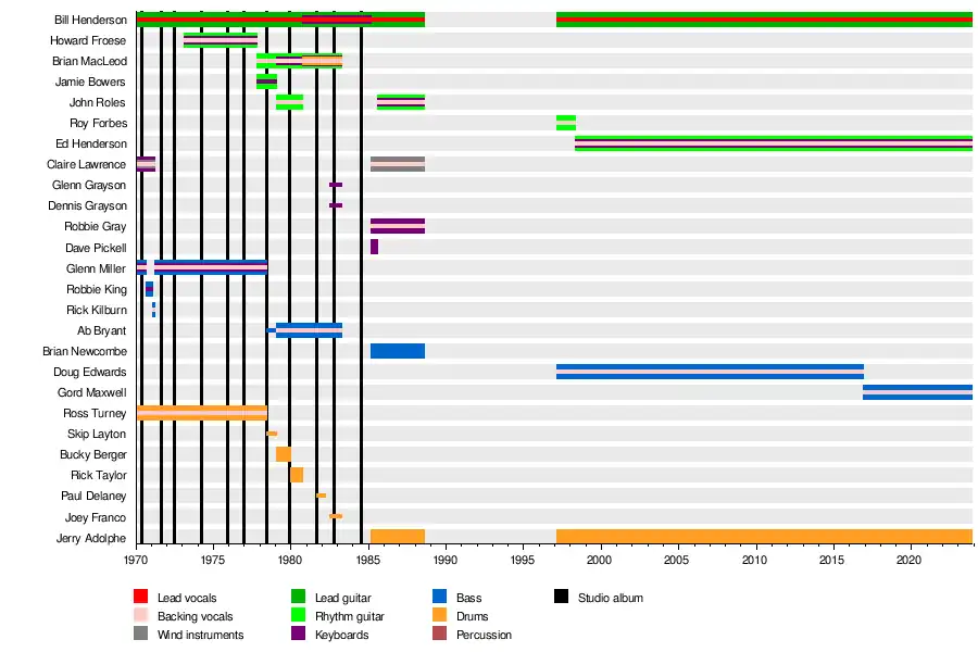 Lead guitarist Bill Henderson led the remaining former Collectors members: Glenn Miller (bass, guitar, backing vocals), Ross Turney (drums) and Claire Lawrence (flute, saxophone, keyboards, backing vocals);[8] while he provided most of the vocals and did most of the composing. During 1970, Miller briefly left the band, who were joined on the road by Robbie King (keyboards, bass) and played at Expo '70 in Japan and other gigs across Canada.