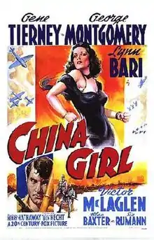 China Girl is a 1942 drama film which follows the exploits of an American newsreel photographer in China and Burma against the backdrop of World War II. The film stars Gene Tierney, George Montgomery, Lynn Bari and Victor McLaglen, and was directed by Henry Hathaway.[2] It is also known as A Yank In China, Burma Road and Over The Burma Road.