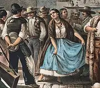 Poblanas (women of Puebla), in a 19th-century vignette. To the left appears a chinaco.