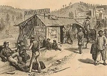 In addition to Deadwood's frontier culture, it was also home to the largest Chinatown of any city east of San Francisco.[1] Although Chinese immigrants also resided multiple areas of the West, many moved to Deadwood following the Gold Rush of this time. As early as 1875, the Black Hills Daily Times began to report that "rice and the 'other necessities of life' " were being transported by train for the "so-called 'Celestial chuckleheads from the Flowery Kingdom.' " [1] The same paper also reported Chinese immigrants who were moving towards Deadwood from Denver, Colorado.[12] The U.S. Census of 1880 lists 116 individuals,[13] but local historians suggest that as many as 400 Chinese individuals, including 14 women, resided in this Chinatown.[4] These individuals established themselves in a quarter of land between Deadwood and Elizabethtown and created what would become "a cultural, social, and economic nucleus for many Chinese living and working in the surrounding smaller mining camps and towns."[14]