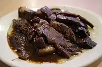 - Haisom cah (炒海參), stir fried trepang with garlic, onion, hioko mushroom, scallion, minced chicken, soy sauce and oyster sauce.