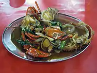 Chinese culinary culture is particularly evident in Indonesian cuisine through the Hokkien, Hakka, and Cantonese loanwords used for various dishes.[2] Words beginning with bak (肉) signify the presence of meat, e.g. bakpau ("meat bun"); words ending with cai (菜) signify vegetables, e.g. pecai ("Chinese white cabbage") and cap cai ("mixed vegetables").[3] Also mi or mie (麵) signify noodle as in mie goreng ("fried noodle").