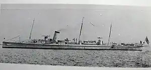 Her main armament was three 14-inch (360 mm) torpedo tubes. Two of them were located in torpedo rooms on both sides of the bows. The third one was on the truck which was located on the stern.[2] There were Schwartzkopff torpedoes in store.[4] Sources conflict as to whether a third tube was present, but reports of three torpedoes being fired in rapid succession at the Battle of Weihaiwei indicates that a third tube was present.[3] There was a secondary armament of two 37 millimetres (1.5 in) guns.[2] Fulong had a complement of 20 officers and men. She had a coal-fired reciprocating engine, with a single boiler and shaft. This produced 1,597 indicated horsepower (1,191 kW), which enabled the vessel to reach a speed of 24.2 knots (44.8 km/h; 27.8 mph).[4]