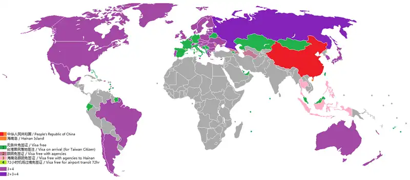 In 2010, China granted visa-free access to citizens of 26 countries who visit Hainan only. It enabled those visitors to visit Hainan Island without a visa for no more than 15 days if they are visiting as part of a tour group organised by a qualified travel agency.[49]