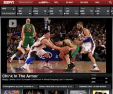 An editor used the phrase as a headline on the company's web site in February 2012; the headline was titled "Chink In The Armor", and referred specifically to Lin.[5] The headline was a reference to Lin's unsuccessful game against the New Orleans Hornets, suggesting that Jeremy Lin's popularity and winning streak were weakening.[6] While ESPN has used the phrase "chink in the armor" on its website over 3,000 times before, its usage in this instance was considered offensive because it directly referred to a person of Asian descent.[7] Many viewed the usage of the phrase as a double entendre.[5] ESPN quickly removed the headline, apologized, and said it was conducting an internal review.[8] The editor, Anthony Federico, denied any idiomatic usage, saying "This had nothing to do with me being cute or punny ... I'm so sorry that I offended people. I'm so sorry if I offended Jeremy."[5] He was fired.[5]