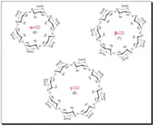 Initially natural CDs have been used as the chiral selector. Later, modified cyclodextrin structures have been prepared by derivatizing the secondary hydroxyl groups present on the CD molecule.[74][75] Incorporation of these additional functional groups may improve the chiral recognition capability by possibly modifying the chiral pocket and creating extra auxiliary interaction site. This approach enabled to expand the range of target chiral analytes that could be separated. A number of chiral pharmaceuticals has been resolved using derivatized CDs including ibuprofen, suprofen, flurbiprofen from NSAID category and b-blockers like metoprolol and atenolol.[76] A brief list of cyclodextrin-based chiral stationary stationary phases available in the market is furnished in the table below.[77]
