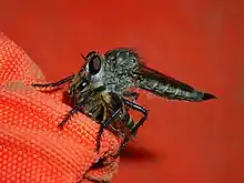 Swarming behavior or "aerial aggregations" is a common social behavior for the fly species.[5][3] There are costs and benefits to grouping with other members of your species. Individuals experience decreased rates of predation. This is due to an overall decline by predators on a swarm as well as the dilution of predator attacks per individual. Feeding has also been proven to be more efficient in larger populations. This may be due to group communication and direction to food and resources. Lastly, swarming of males increases the attraction of females, because the sound of the flight tone is amplified when they band together.[1] This may not necessarily increase reproductive success of all individuals, but rather individuals that are able to detect and mate with females first experience the benefit of increased reproductive fitness.[2]