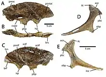 Currie and Russell also addressed the complicating issue of a possible second form being present in the material. In 1933 William Arthur Parks had named Ornithomimus elegans, based on specimen ROM 781, another foot from Alberta.[9] In 1971, Joël Cracraft, still under the assumption Caenagnathus was a bird, had named a second species of Caenagnathus: Caenagnathus sternbergi, based on specimen CMN 2690, a small lower jaw. In 1988 Russell and Currie concluded that these fossils might present a more gracile morph of Chirostenotes pergracilis. In 1989 however, Currie thought that they represented a separate smaller species, and named this as a second species of the closely related Elmisaurus: Elmisaurus elegans.[10] In 1997, this was renamed to Chirostenotes elegans by Hans-Dieter Sues.[11] The species was moved to the new genus Leptorhynchos in 2013.[12]