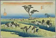 Chiryū-juku was noted for a famed Shinto shrine, the Chiryū Daimyōjin, and also for its flourishing horse market, held in late April to early May of each year. Tokugawa Ieyasu ordered that the post station plant pine trees along through route of the highway before and after the town. The classic ukiyo-e print by Andō Hiroshige (Hōeidō edition) from 1831 to 1834 depicts horses, and also one of the pine trees. Hiroshige entitled the work Summer Horse Market (首夏馬市, Shuka Umaichi).[1] Despite the construction of railroads following the Meiji restoration the horse market continued into the Shōwa period, and most of the pine trees survived until the 1959 Isewan Typhoon.